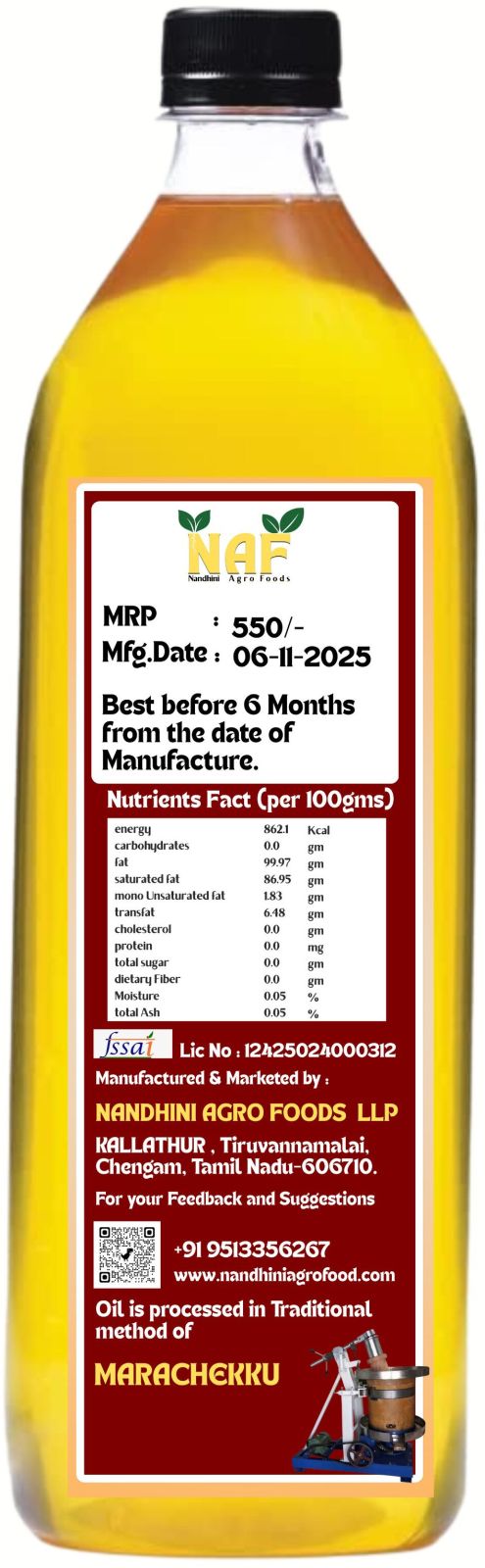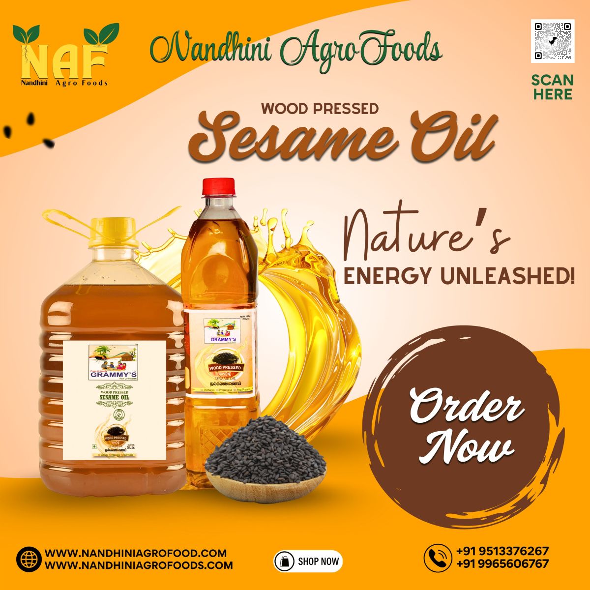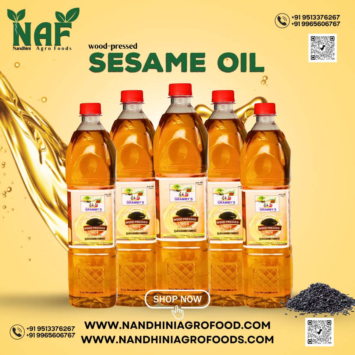 Welcome to Nandhini Agro Foods, where purity meets wellness. As the top cold-pressed oil manufacturer in Bangalore, India, we offer our pure organic sesame oil to B2B buyers, departmental stores, and retailers with customized white-label services.Derived from top-quality sesame seeds, our wooden cold-pressed sesame oil ensures purity and a lovely scent in each drop. Based in Bangalore, we wholesale our cold-pressed oils to major cities like Chennai, Coimbatore, Hyderabad, and Mumbai. We use conventional techniques to obtain our sesame oil, guaranteeing top-notch quality and flavor, making it ideal for various industry requirements. Our cold-press method maintains the sesame seeds' vital nutrients, scent, and tastes, giving you a product that promotes your meals and good health. At Nandhini Agro Foods, we prioritize quality and customer satisfaction by providing the best cold-pressed oil products.If you are a retailer or a business needing top-notch sesame oil, we guarantee that our products will meet your exact needs while preserving the natural goodness of the product.